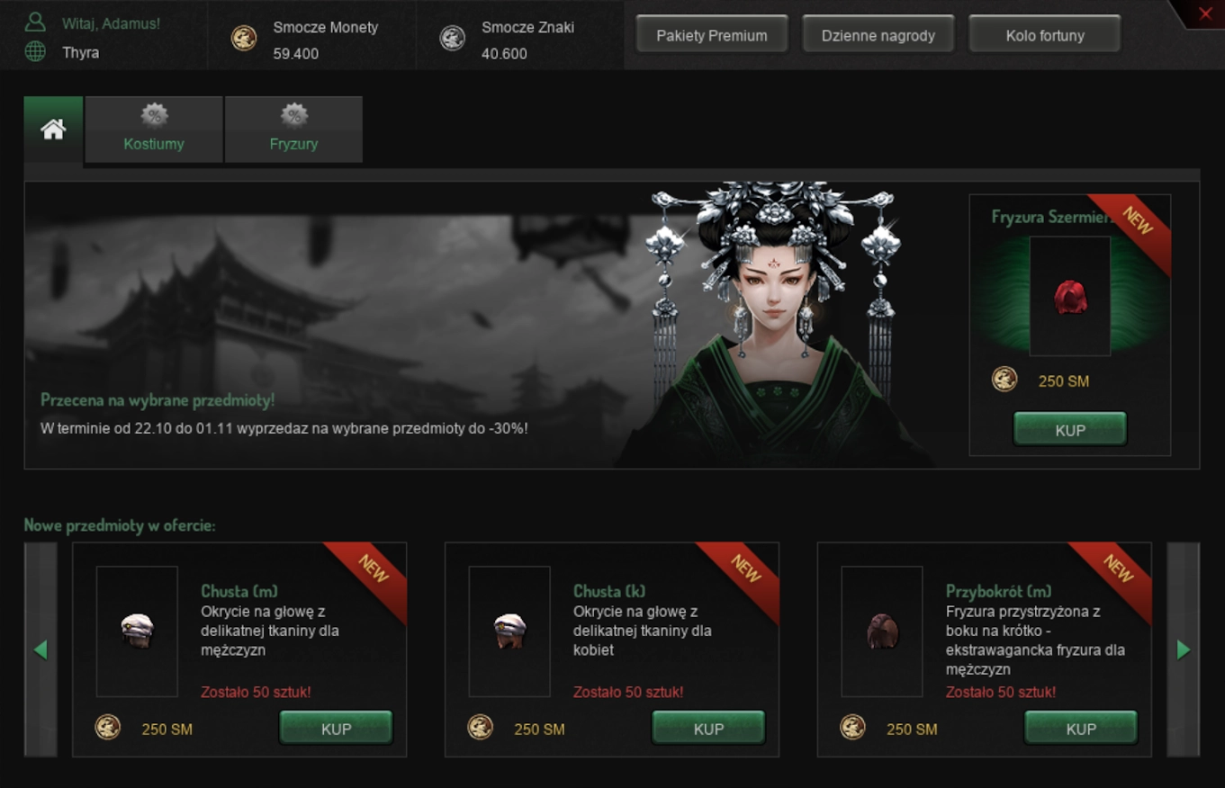 Garderoba [ikona garderoby] pozwala przymierzyć każdy dostępny kostium, fryzurę, nakładkę czy szarfę. Wystarczy jedno kliknięcie, aby zobaczyć podgląd wybranego przedmiotu bezpośrednio na swojej postaci. Idealne narzędzie do szybkiego wyboru wyglądu.