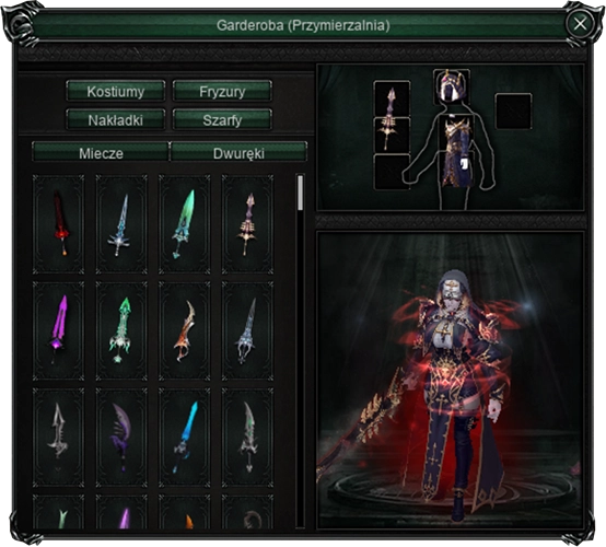 Garderoba [ikona garderoby] pozwala przymierzyć każdy dostępny kostium, fryzurę, nakładkę czy szarfę. Wystarczy jedno kliknięcie, aby zobaczyć podgląd wybranego przedmiotu bezpośrednio na swojej postaci. Idealne narzędzie do szybkiego wyboru wyglądu.